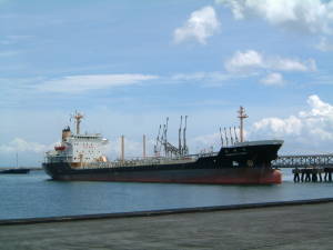 タンカーが着ける桟橋には宗像海運(東京都)の「宗像丸」(5,847t)がいました。 この様子だともうすぐ荷降ろしも終わりのようですね。