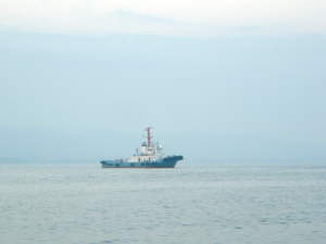 沖のほうを見ると大きな外航船がこちらへ向かってきているところでした。木材を運んできたようです。