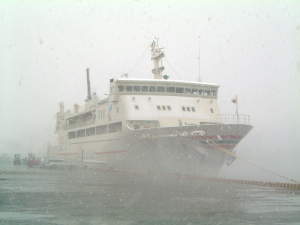 さてさて、南埠頭へやって来ました。うっすらと雪化粧をした「フェリーとしま」です。