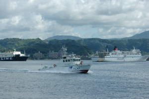 あー、暑い。今日もバカのように天気の良い1日でした。気温もぐんぐん上がりヘタしたらこっちもバカになりそうです。来週の巡視船クルーズの日も こんなに暑いのかしらん。1時間くらいのようですが、暑いだろうな、キツイだろうな、・・・はぁ。 今日もまずは新港へ行ってみました。ちょうど、出港する「フェリー屋久島2」と入港中の「わかなつ おきなわ」、そして「さつかぜ」を一緒に撮影する ことができました。わーい。