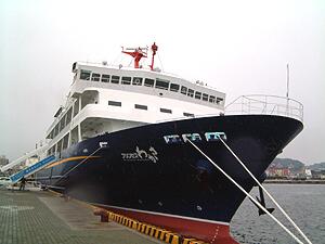 入港が遅れたおかげで「ニューあかつき」も見ることが出来ました。海が時化ていたのかな?それとも出港が遅れてしまったのかな??それはさておき、 ドックのすぐ後ということで船体がとてもきれいでした。